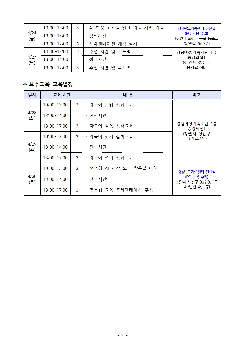 ○ 교육장소 : 경상남도여성가족재단 교육장 등 *교육 장소는 일정에 별도 표시