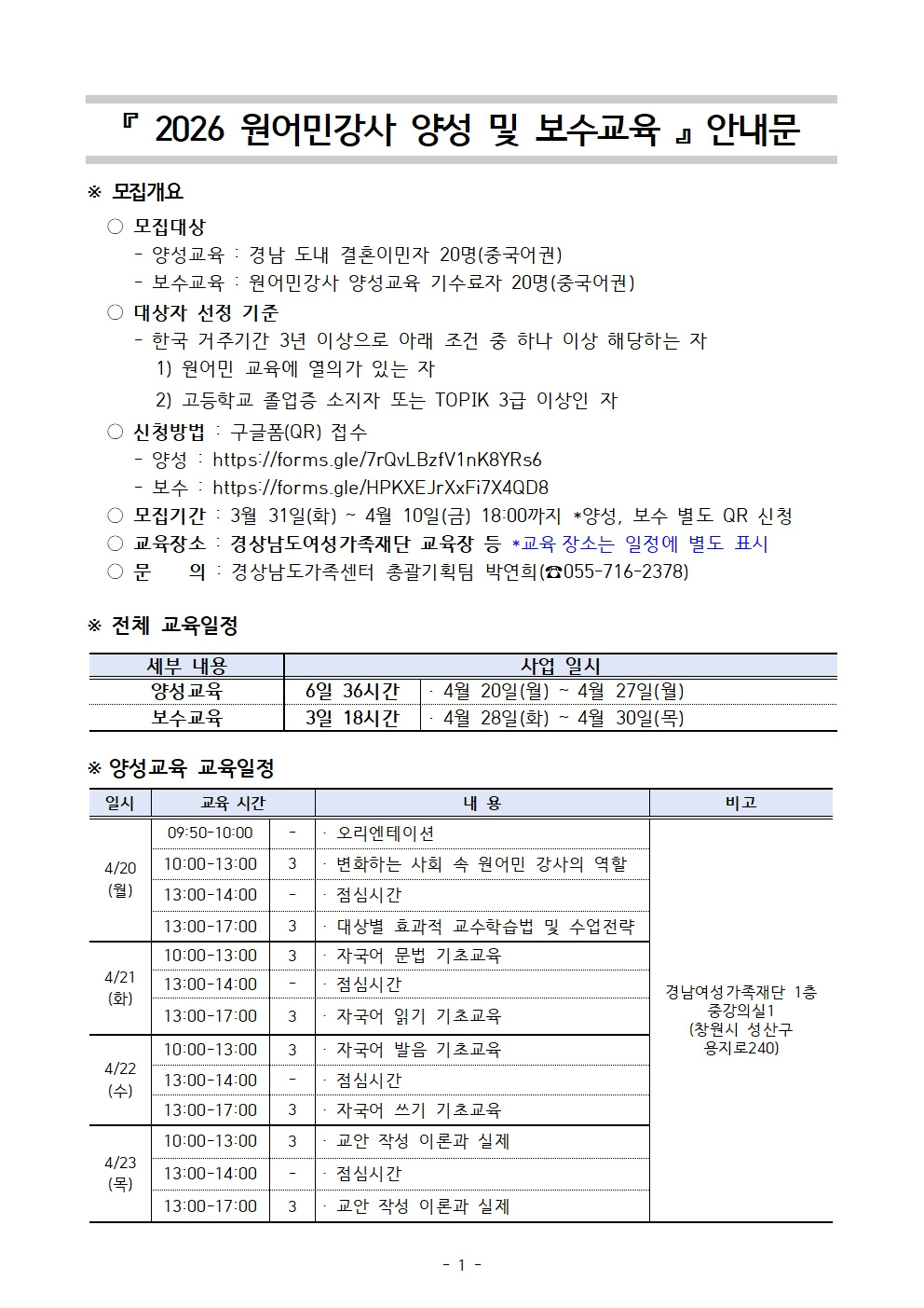 경상남도가족센터 2026 원어민강사 양성 및 보수교육(중국어권) 대상자 모집