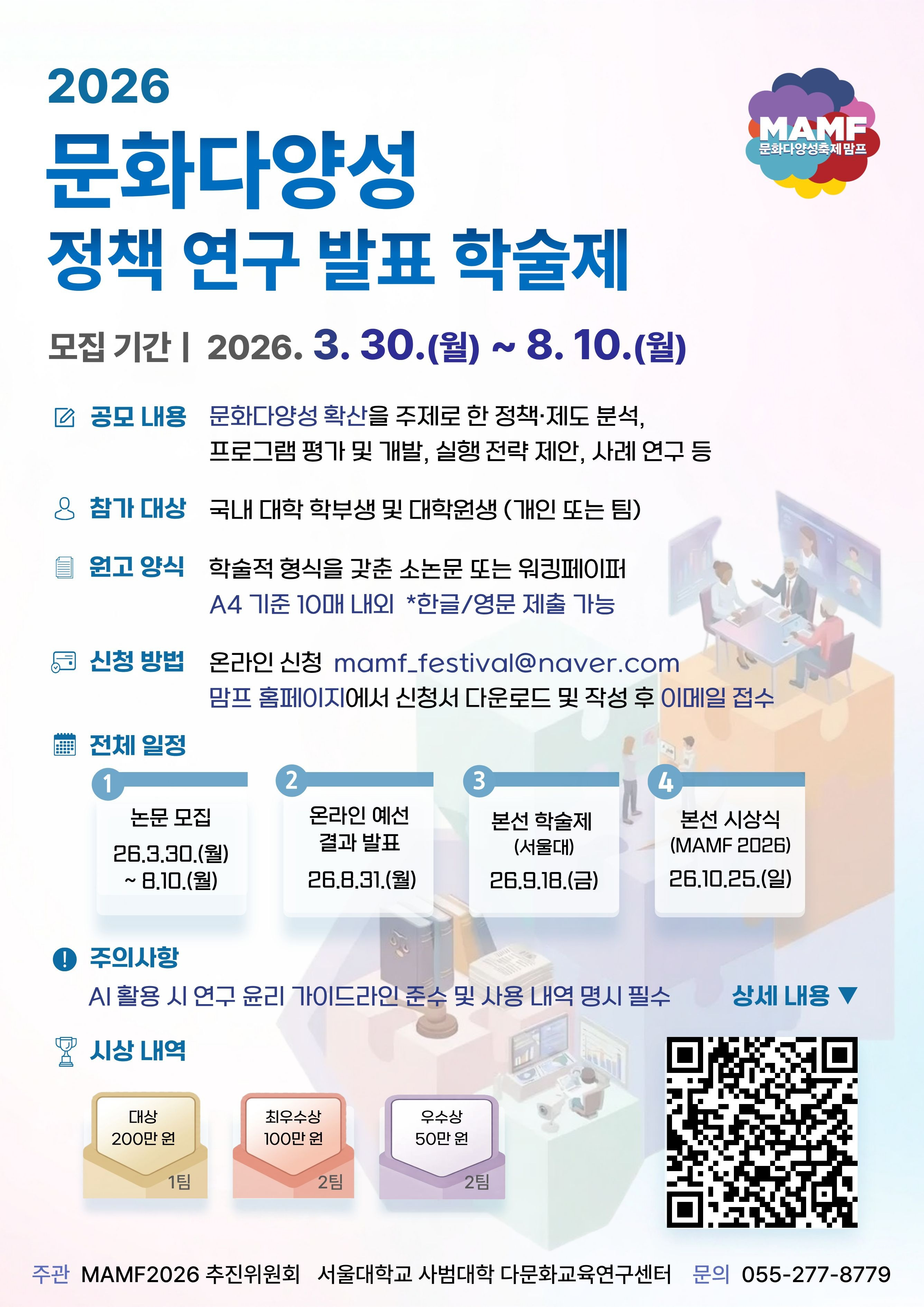 - 공모 내용: 문화다양성 확산을 주제로 한 정책·제도 분석, 프로그램 평가 및 개발, 실행 전략 제안, 사례 연구 등