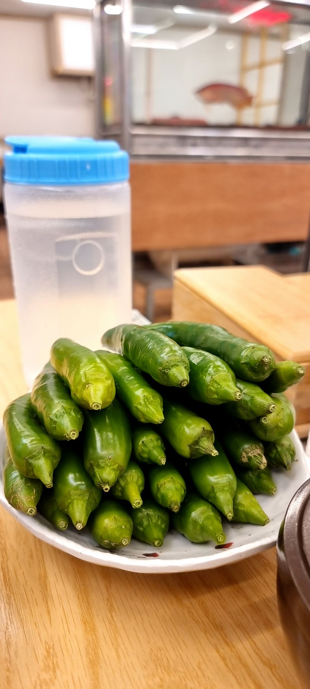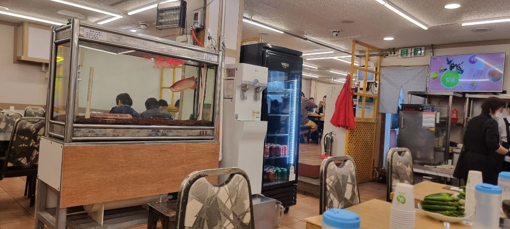 음식을 주문하고 테이블에 앉아 있으면, 소박하게 배치된 수족관에서 아로아나의 유영을 감상할 수 있습니다.