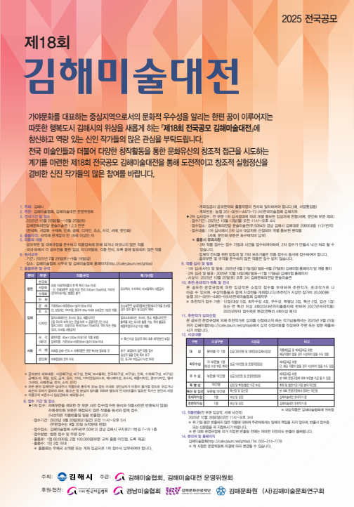 [김해미술대전]2025년 제18회 전국공모 김해미술대전 개최요강 작성자이수진 사무국장|작성시간25.07.29|조회수2,070 목록 댓글 0 글자크기 작게가 글자크기 크게가 2025김해미술대전 개최요강.pdf1.83MB2025김해미술대전 포스터.pdf1.86MB 첨부파일첨부된 파일이 3개 있습니다. png 파일 image.png 다운로드 pdf 파일 2025김해미술대전 개최요강.pdf 다운로드 pdf 파일 2025김해미술대전 포스터.pdf 다운로드 다음검색 현재 게시글 추가 기능 열기 북마크 공유하기 신고 센터로 신고 댓글 댓글 0 댓글쓰기 답글쓰기 댓글 리스트