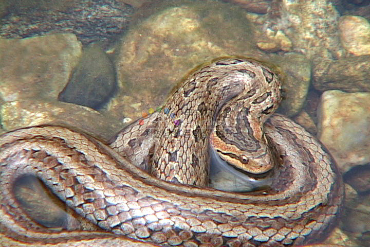 몸통의 비늘은 대개 21줄인데 목 부분에서 23줄, 항문 근처에서는 17~19줄이다. 배판은 154∼200개이지만 개체에 따라 다르고 꼬리밑판은 47∼67개이다. 비늘은 매끈하며 등쪽 비늘줄이 조금 융기된 개체도 있다. 독이 없고 난태생으로 8월 말에 12∼16마리의 새끼를 낳는다. |