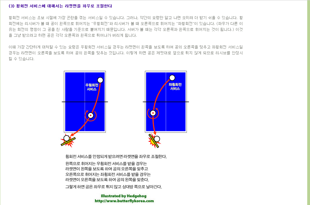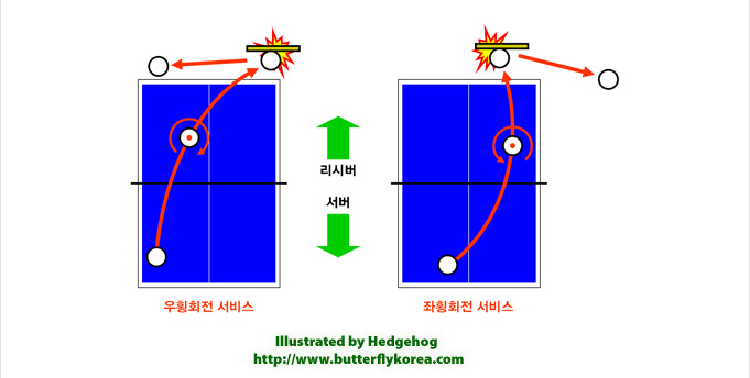 윈 리 | 공은회전하는방향과 반대방향으로 튀어나가려는 속성이 있는데 이 튀어 나가려는 방향에 라켓을 갖다대어 공이 튀어나가지 못하게 안전하게 막아준다 | 공의 회전하는방향에 같은 방향의 힘을 가하여 오히려 상대방의 회전을 그대로 되돌려 준다 | 공의 회전하는 방향과 반대 방향의 힘을 가하여 오히려 상대방에게 더 강한 역회전을 돌려 준다 |
