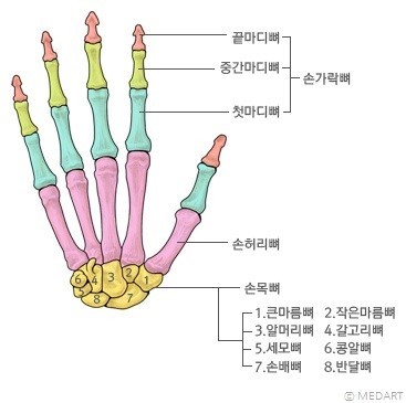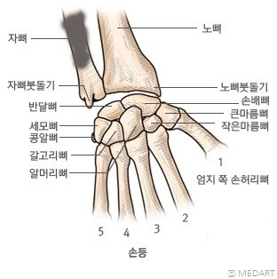 즉, 전 노뼈의 노뼈붓돌기와 자뼈붓돌기를 손배뼈와 반달뼈를 같이 붙여서 고정을 시켰다는 것입니다.