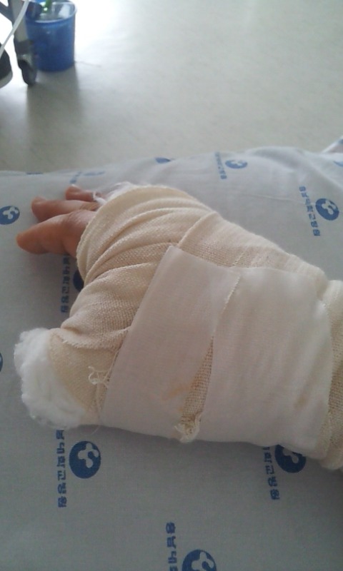 금요일 예정이였던 수술이 화요일로 급하게 변경되어서 월요일날 부랴부랴.입원하고 어제 수술했어요. 전신마취한다고 금식시키더니 국소마취하기로 했다고 하면서 목쪽에다 주사를.놓고 기다리니.팔전체가 절이는느낌이 나더라구요 그래도 무서우니 수면제 하나 놔달라해서.잠이들었어요.그.런.데 저는 마취가.풀려서 손가락 종양을 제거하고 자르고 하는 고통을 고스란히 느끼며 아 아 아 울면서 고통을 호소했고 급하게 수면제를 한대.더 놔주더군요. 그러나 그기억을 지울수가 없을것같아요 지금도손가락 고통이 심하지만 병원생활이 지루하여 왼손으로 타이핑하고 있어요. 레지던트 주임 완전싸가지한테 나 국소마취풀린거 기억한다고하니깐 정색하며 마취사가 분명 그런일이 일어날수도 있다고 설명하지않았냐는식으로 말하더군요. 그냥 말이라도 많이 아프셨냐 고생하셨다 하면 얼마나 좋을까.암튼 교수님과 회진할때는 친절대마왕. 이중인격자.윽. ... 교수님께선 오늘오셔서 말쑴하시는데요.거대세포종이라고 확신했는데 아닌것같다며 뭔지 자기도 확실하지않아 조직세포검사 하신다고하시더군요.일단 양성종양은 맞고 다 제거했다시며 많이 아플꺼러고 하시더군요. 종양 제거하는게 어렵진않았지만 피부안쪽 앏은 피부까지 종양이 엉켜있어서 고생하셨다며 피부재생시간 좀 걸릴수도 있다고 하시며 몇일더 입원하라고 하시더군요.아프고 덥고 지루하고 집에.빨리가고싶어. 그리고.이종양이 확실히 뭔지 빨리 알았으면 좋겠어요.
