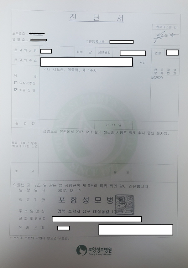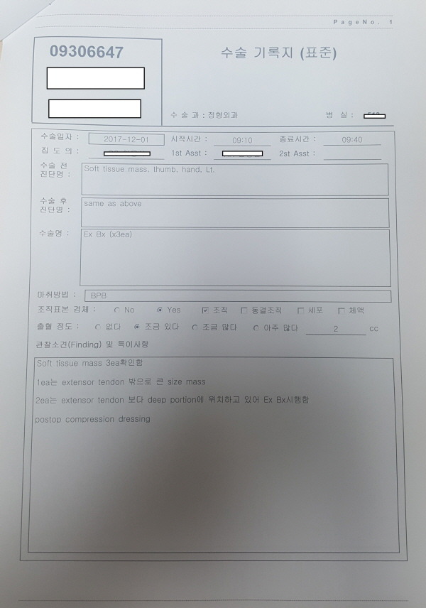 제가 2017년 12월에 죄측 엄지손가락 중간부위에 거대세포종이 생겨 수술을 받았습니다.
