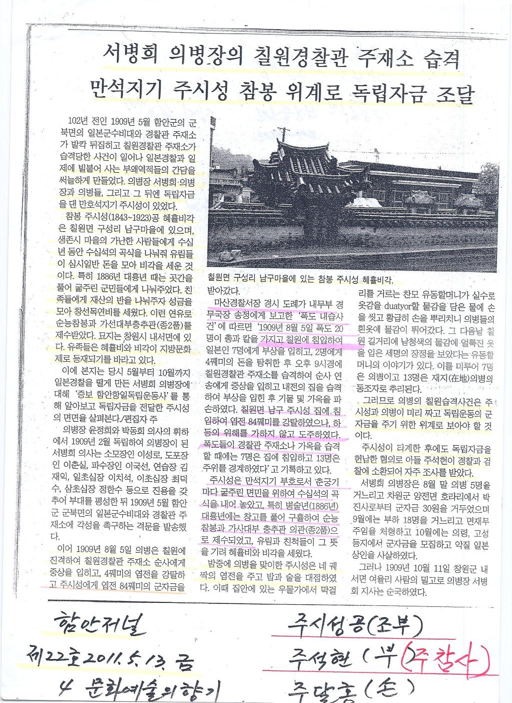 "목연비" "혜휼각" "주시성 사행비" "주시성 송덕비" "주석현 친선비"등은 친일파에게 바칠수 없는 비각임을 미루어 볼때 더 큰 애구투사였을지도 모르기 때문입니다 ! 이 문안을 스켄해 올리면서 필자(사무국장)의 눈시울이 뜨거워져 옮을 감당하기조차 어렵읍니다 !!
