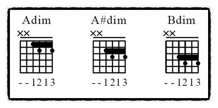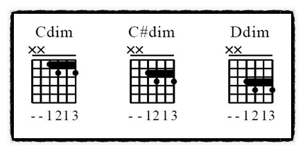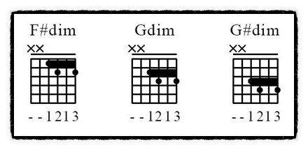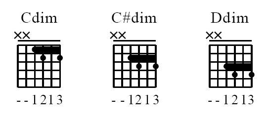 자, 세개의 그림을 자세히 보시면 Cdim 코드부터 차례대로 한칸씩 옆으로 이동해서 잡는게 보이십니까?