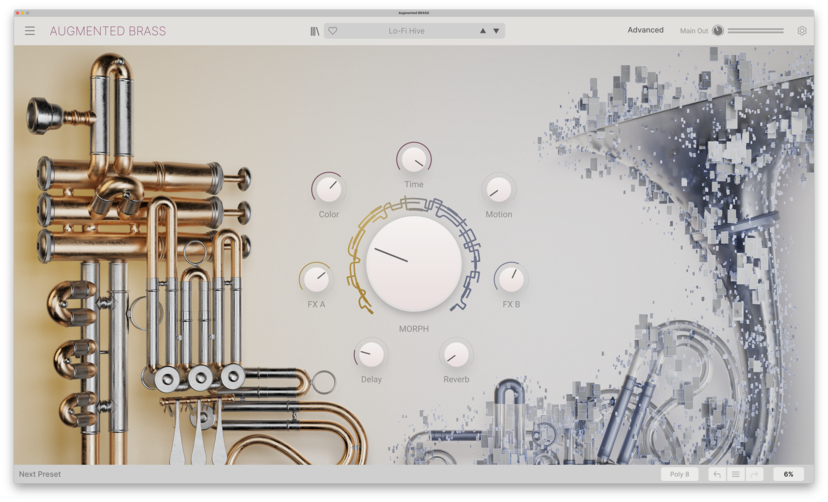 중앙의 Morph 컨트롤을 사용하여 Augmented BRASS의 각 요소 사이의 흥미로운 음향 영역을 탐색하세요.
