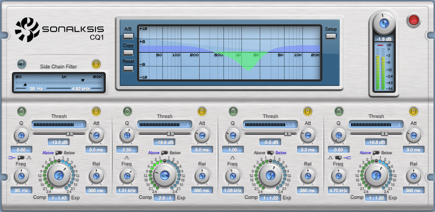 CQ1은 다중 대역 주파수 선택 다이내믹스 프로세서로, 자유롭게 조정 가능한 4개의 필터 대역을 독립적으로 압축하거나 확장할 수 있습니다. 주로 복합 프로그램 자료를 마스터하도록 설계된 일반적인 멀티 밴드 컴프레서와 달리 CQ1은 '다이나믹 이퀄라이제이션' 원리를 사용하므로 훨씬 더 광범위한 응용 분야에 적합합니다.