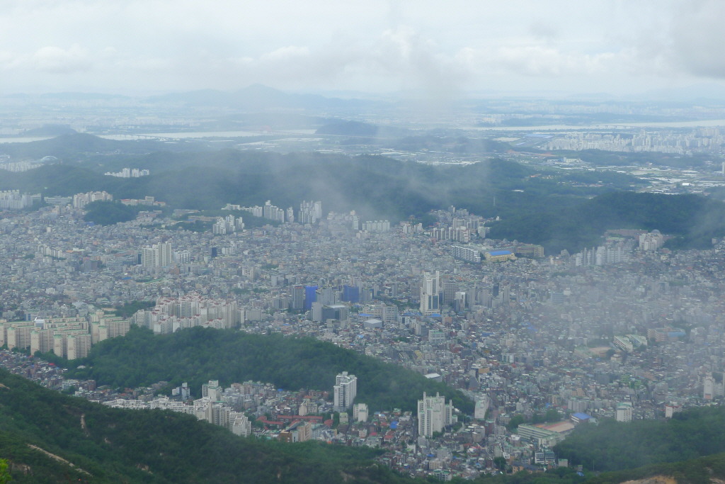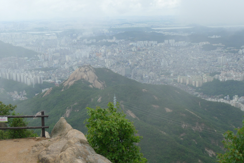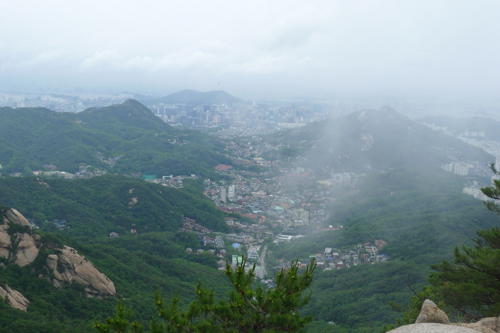 북악산(좌), 남산(중), 인왕산(우) 사이로 시가가 보이고..구기동, 세검정, 부암동 일대가 선명합니다..