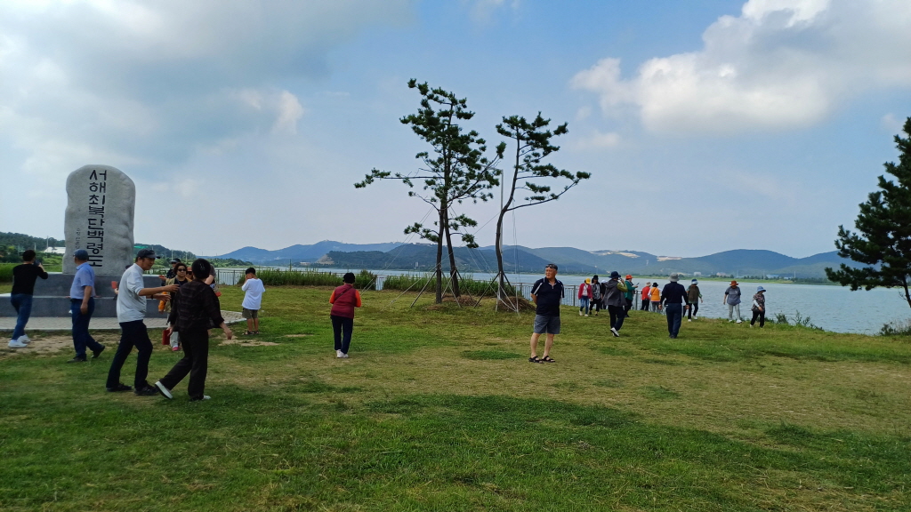 사곶천연 해변과 백령호를 가르는 서해최북단백령도비. 바다였던 백령호는 매립후 30년이 넘어 지금은 민물이 되었습니다.