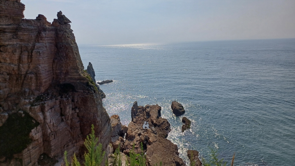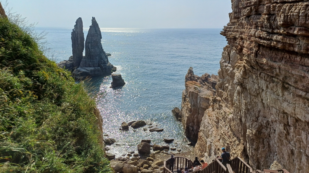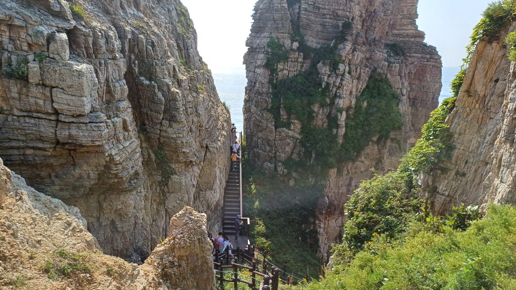 지질학적으로 모래가 굳어진 사암에서 규암으로 된 절경의 암벽사이에 해변으로 내려가는 데크 길이 잘 놓아져 있습니다.