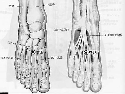 족양명위경의 43번째 혈로서 발등의 두번째 세 번째 발가락 사이 우묵한 곳에 있으며 2지와 3지 위치에 있습니다.