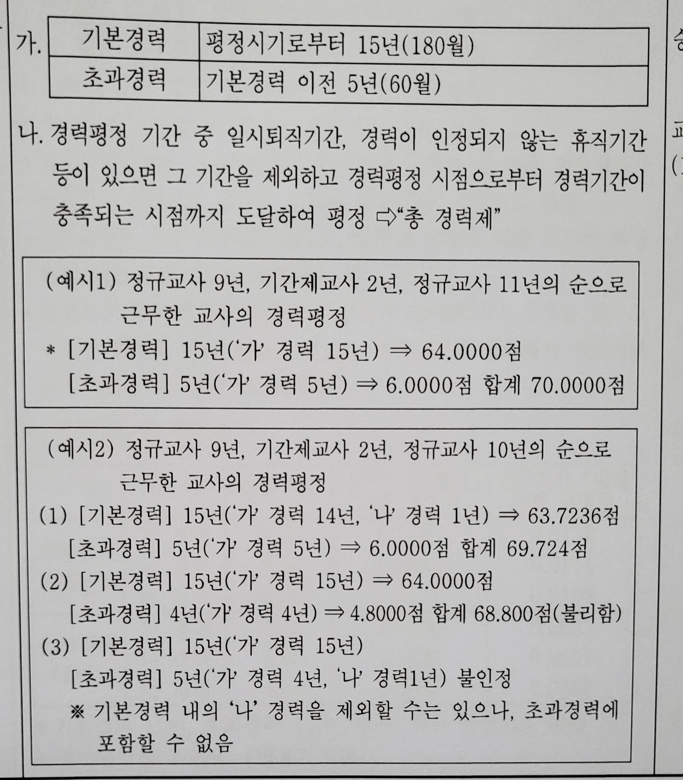안녕하세요? 저는 기간제교사경력 7년, 정교사경력 3년 30대 후반 교사입니다. 기간제교사일때 경력은 '나 경력'에 해당하며 총20년 경력에 포함할 시 큰 손해가 있어 사실상 기간제 경력은 포기해야 하는 경력이더군요. 1년이라도 포함시키면 큰 손해더라고요. 정교사 경력만으로 20년 채우려면 오십대 후반에야 승진이 가능할 것 같아서 포기하게 되네요. 작년에 교육전문직 자격요건에 기간제교사 경력 100프로인정으로 바꼈는데 아쉬운 부분이에요. 장기간 기간제교사를 했던 교사는 거의 승진이 안될 조건이네요.