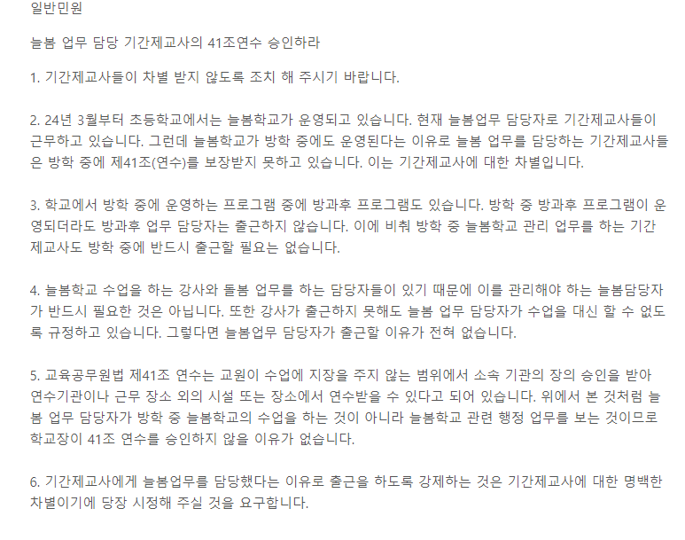 늘봄학교 담당을 맡으신 기간제교사의 41조 연수에 대해 경기도교육청에 다음과 같이 시정 요구를 했습니다.