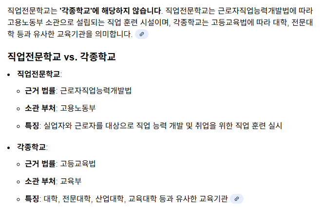 혹시 직업전문학교가 각종학교에 속하는지 알아봤는데 이에 속하지 않는다고 나옵니다.