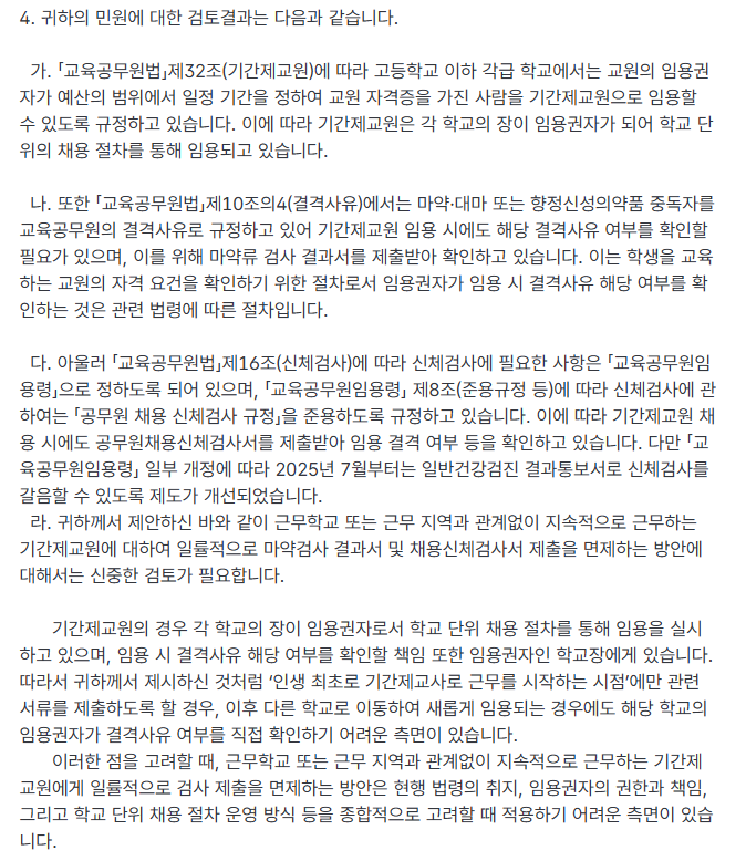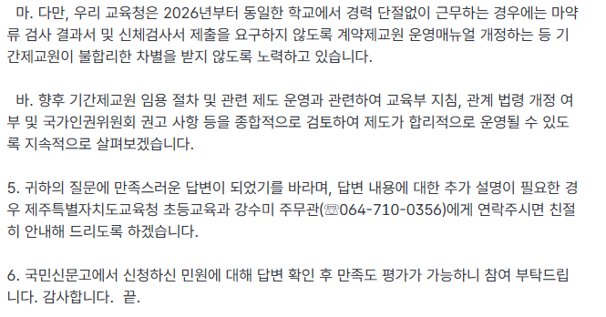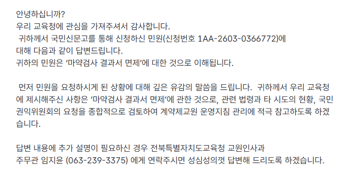 마약검사, 채용신체검사에 대한 제주, 전북교육청 답변 작성자노조위원장|작성시간26.03.17|조회수55 목록 댓글 0 글자크기 작게가 글자크기 크게가 <제주교육청 답변><전북교육청 답변> 다음검색 현재 게시글 추가 기능 열기 북마크 신고 센터로 신고 댓글 댓글 0 댓글쓰기 답글쓰기 댓글 리스트
