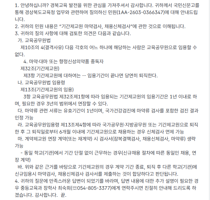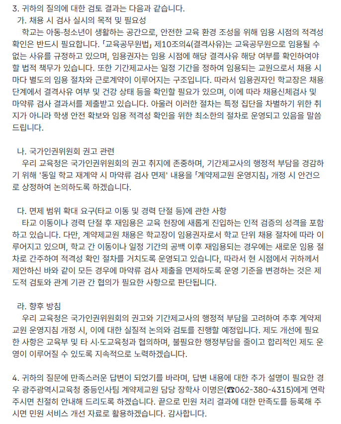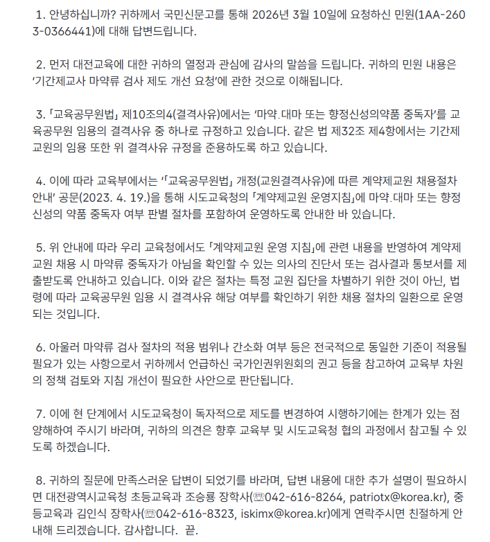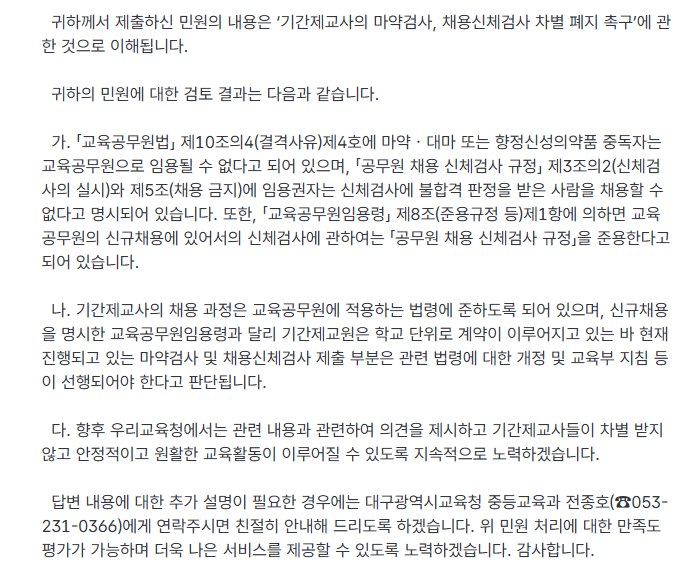 마약검사, 채용신체검사 대전, 대구, 광주, 경북 교육청 답변 작성자노조위원장|작성시간26.03.17|조회수157 목록 댓글 0 글자크기 작게가 글자크기 크게가 <대전교육청><대구교육청><광주광역시교육청><경북 교육청> 다음검색 현재 게시글 추가 기능 열기 북마크 신고 센터로 신고 댓글 댓글 0 댓글쓰기 답글쓰기 댓글 리스트