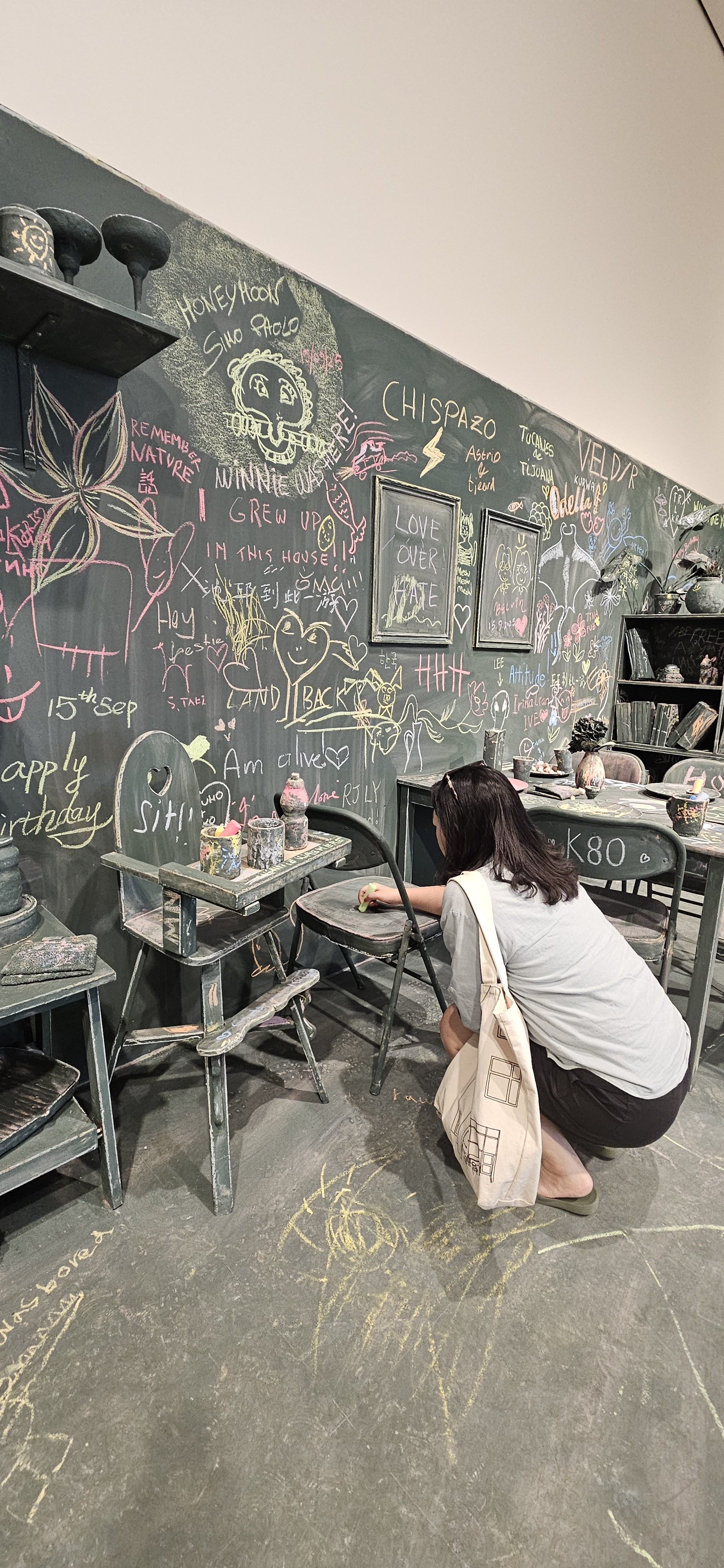 벽, 가구, 소품들에 분필로 마구 낙서 ( 예술활동)를 한 듯한 공간이 특이하다