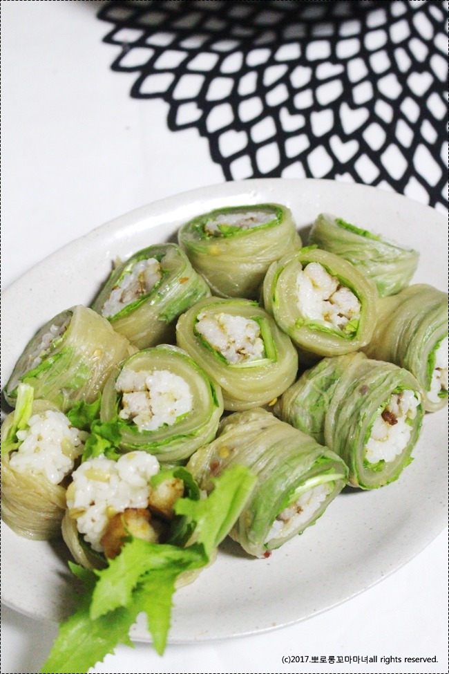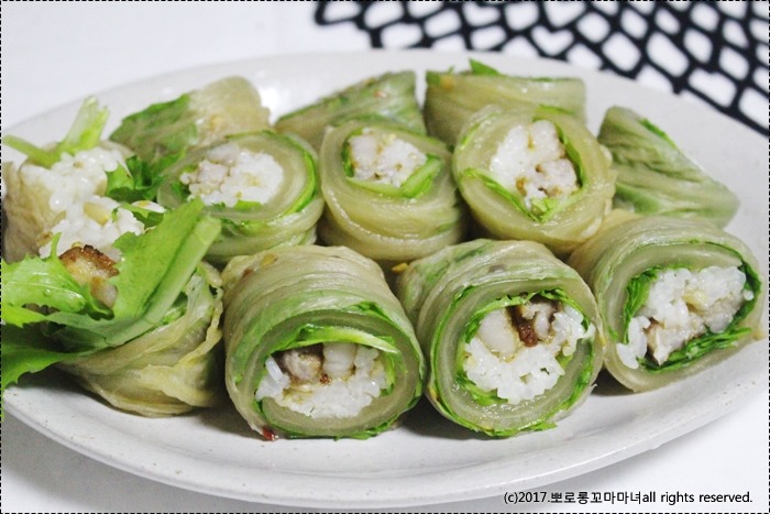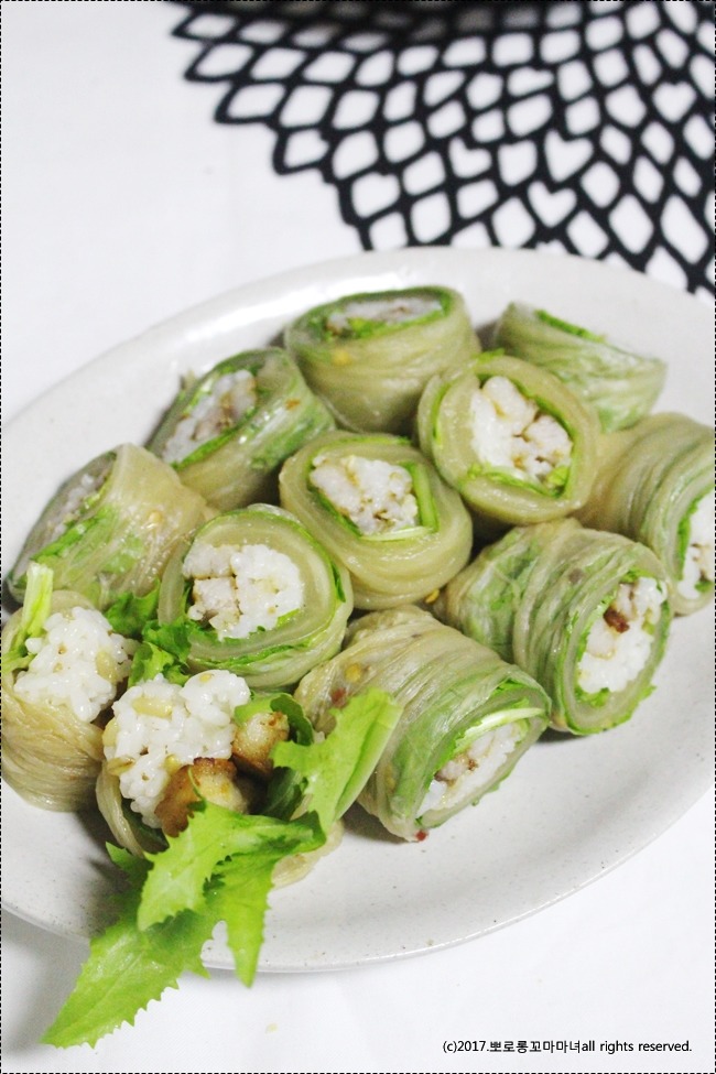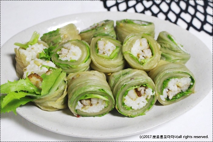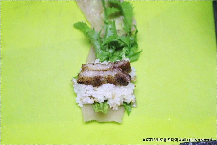 삼겹살 올려서 돌돌 말아주며 완성이에요.