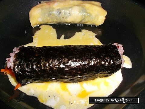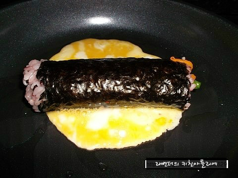 터진 옆구리 부분을 계란과 맞닿게해서 약불에서 돌돌 말아 주구요~