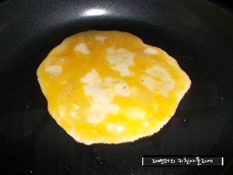 계란 1개 소금 약간 넣어 후라이팬에 반만 부어 살짝 익힌 뒤