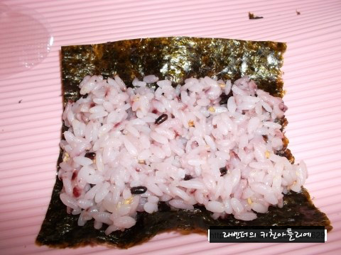 김 끝에 밥풀 묻혀 으깨 접착제 역할해줘서 돌돌 말아줬어요~