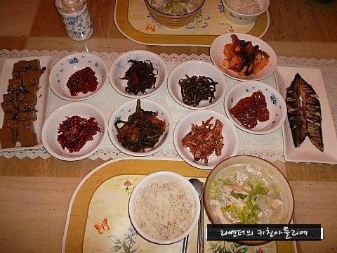 메뉴는 닭곰탕,도토리묵,꽁치구이,알타리김치,연근조림,마늘쫑멸치볶음,말린갈치조림,고춧잎무침,