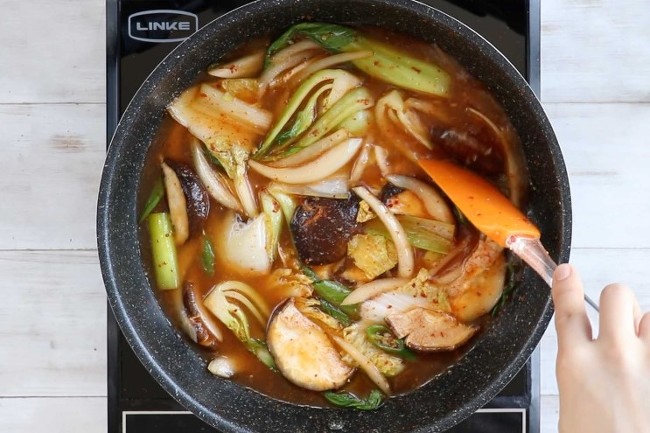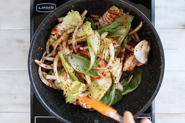 6. 손질한 표고버섯, 양파, 청경채를 볶다가
