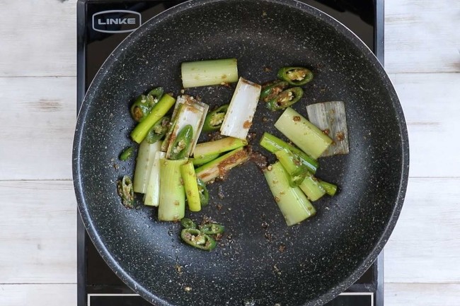 5. 팬에 기름을 두르고 다진 마늘, 대파,