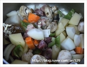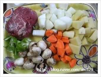 채소 : 당근, 감자, 양송이 버섯, 양파, 피망을 사각썰기 합니다.