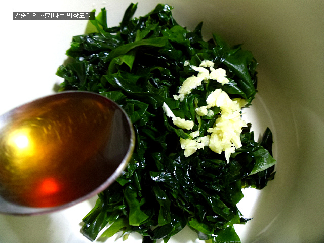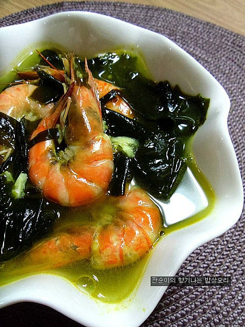 재료:불린미역,새우,멸치육수,다진마늘,멸치액젓,참기름