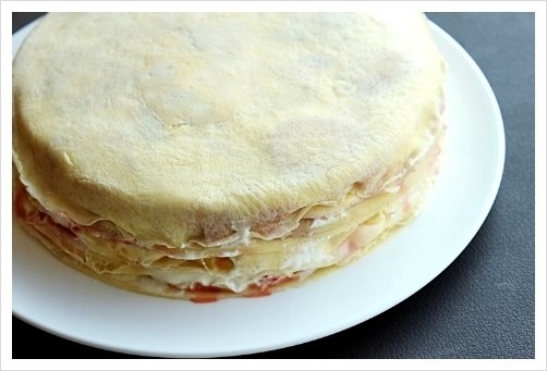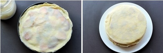 케이크 틀에 꽉 차도록 쌓아지면 맨 위에 다시 크레페를 덮는다