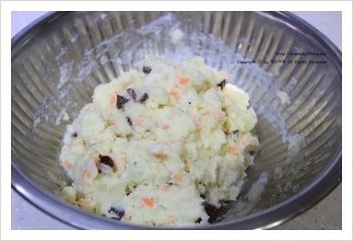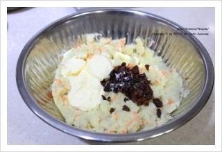 감자가 좀 식으면 건포도와 마요네즈, 소금을 넣어서