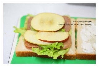 얇게썬 사과를 올리고 식빵 하나를 덮고 식빵면에 마요네즈를 얇게 발라주세요..