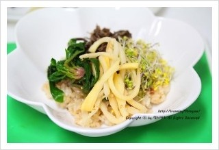 고사리나물, 도라지나물, 시금치나물 한줌씩..새싹채소조금, 계란1개, 밥 0.7공기, 참기름조금, 고추장 0.5큰술... |