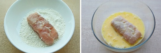 만들어진 돈까스 재료를 밀가루-달걀-빵가루 순으로 묻혀준다