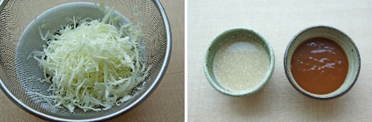 양배추는 곱게 채를 썰어 섞어서 찬물에 헹구었다가 물기를 뺀다