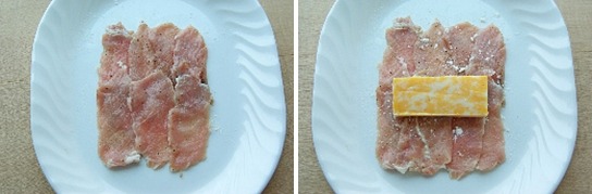 접시에 치즈를 감쌀 수 있는 넓이로 돼지등심을 펴 준 후