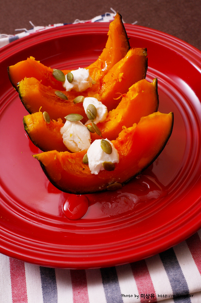 찐 단호박 위에 리코타 치즈를 올린 간단한 요리입니다.
