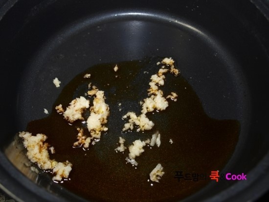 먼저 달군 팬에 다진 마늘과 고추기름 1큰술 식용유 1큰술을 넣고 볶다가