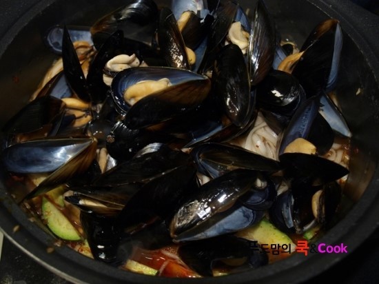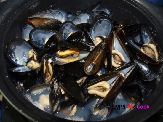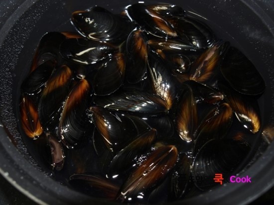 손질한 홍합을 냄비에 담고 팔팔 끓여 익혀 줍니다