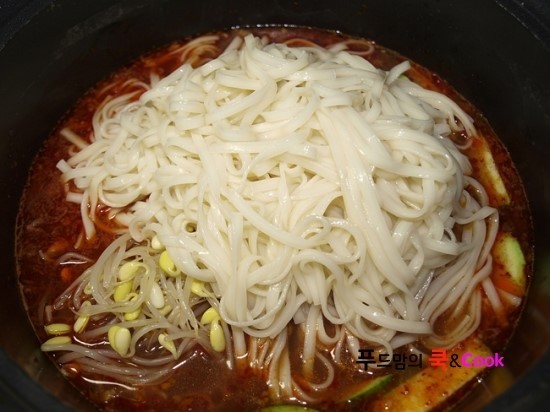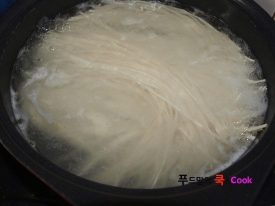 육수가 끓을때 삶은 칼국수 면을 넣고