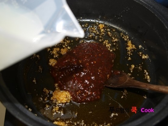 양념장 그리고 홍합 삶은 물 1컵을 부어 줍니다
