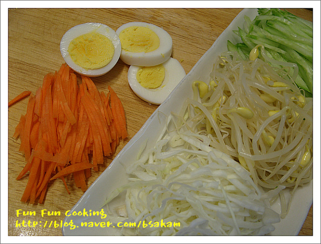 양배추는 곱게 채설어 주시고 당근과 오이도 곱게 채썰어 준비합니다.