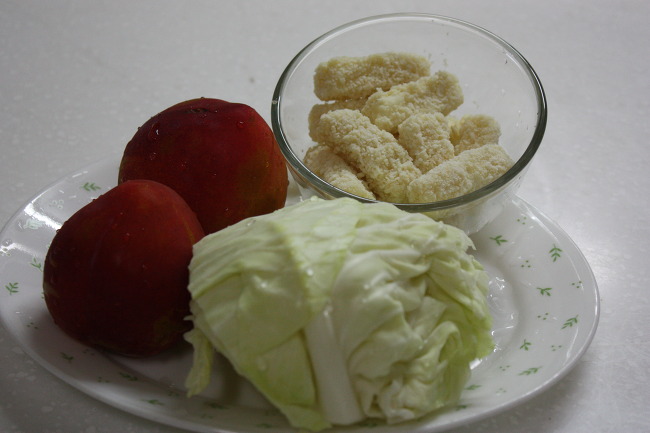 냉장고에 있는 양배추 잘라서 얼음물에 담궈 주시구요.