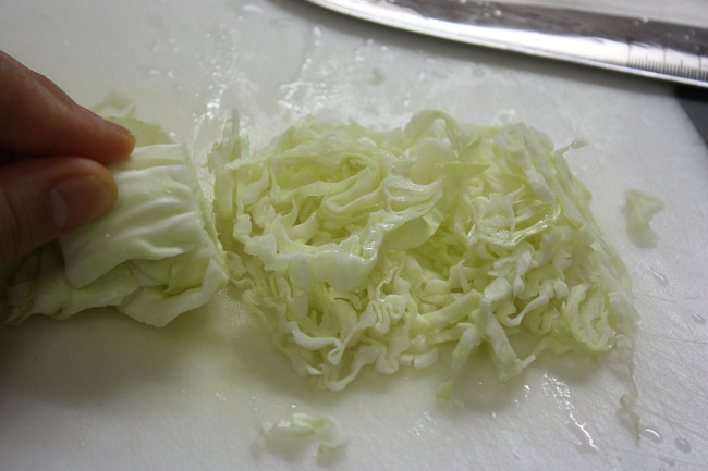 양배추 심은 자르고, 돌돌 말아 채 썰어 주구요.