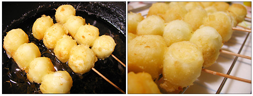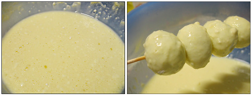 튀김옷이 만들어졌으면 꼬치를 들고 숟가락으로 반죽을 끼얹으며 골고루 묻혀줍니다.
