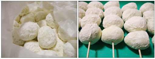 꼬치채로 볼에 담그면 나무꼬치가 지저분해져 미관상 좋지 않고 작업하기도 불편하답니다.